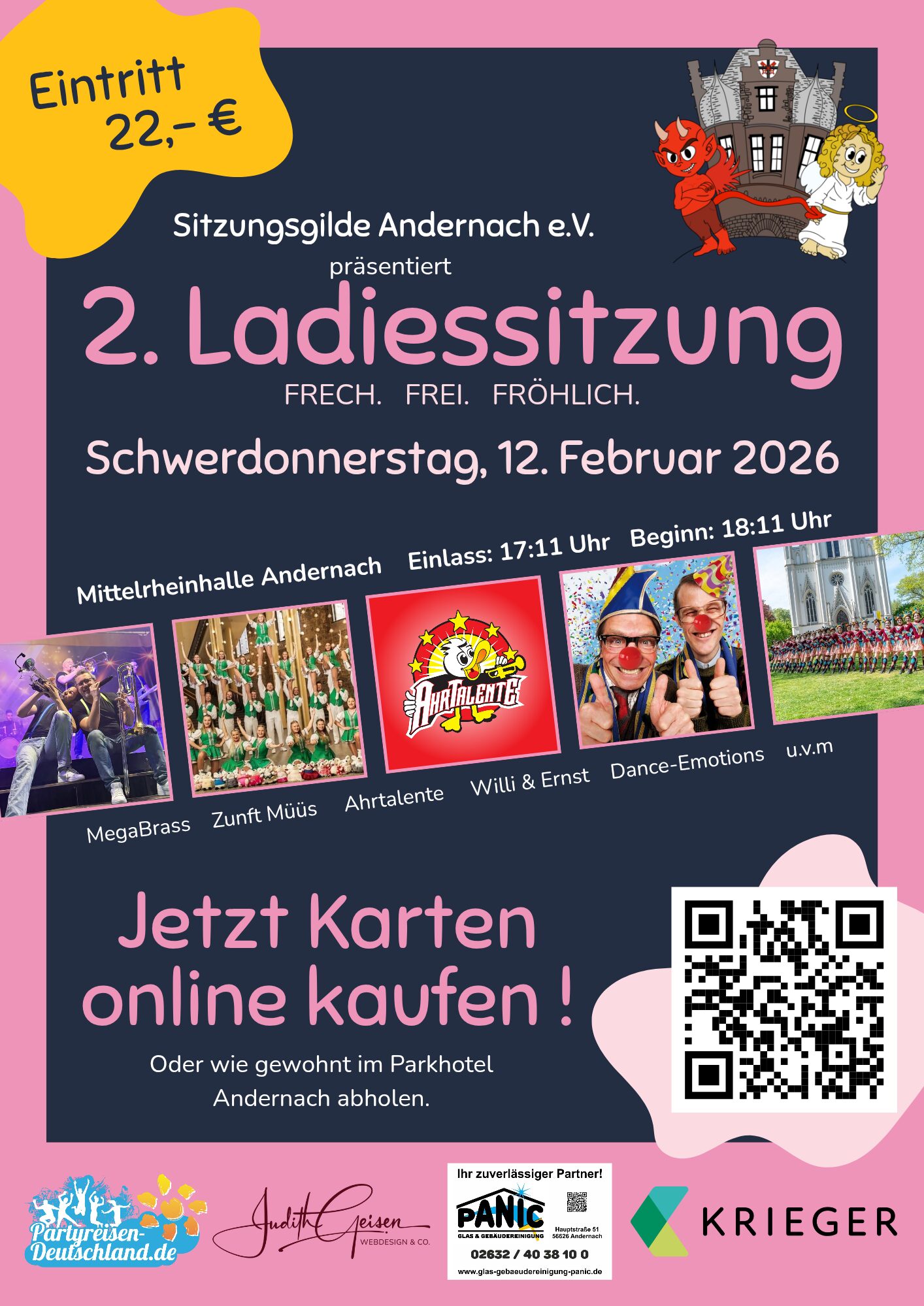 Der Ticketshop öffnet am 19.09.2025 um 11:11 Uhr – inklusive Early Bird Rabatten und Verpflegungspaketen. Wir freuen uns auf eine Ladiessitzung unter dem Motto FRECH. FREI. FRÖHLICH. und eine Herrensitzung die LAUT. LUSTIG. LEGENDÄR. zu sein scheint – und auf alle, die Lust haben, aktiv mitzuwirken!